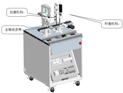 接(jiē)收上一工作站填裝好顆粒的瓶子,當瓶子(zǐ)被輸送到加蓋機構(gòu)後,主(zhǔ)輸送皮帶停止,夾蓋(gài)定位夾緊(jǐn)機構將瓶子固定,加蓋機構啟動加蓋流程,將蓋子加到瓶子上;加(jiā)好蓋子(zǐ)後主輸送皮帶啟動,加上蓋子的瓶子繼續被(bèi)送往擰蓋機構,到擰蓋機構下方,主輸(shū)送皮帶停止,擰蓋定位夾緊機構將瓶子(zǐ)固定,擰蓋(gài)機構啟動,將瓶蓋(gài)擰緊,主(zhǔ)輸送(sòng)皮帶啟動,將擰好蓋子的物料瓶輸送到下一工位。瓶蓋分(fèn)為白色和黑色兩種。