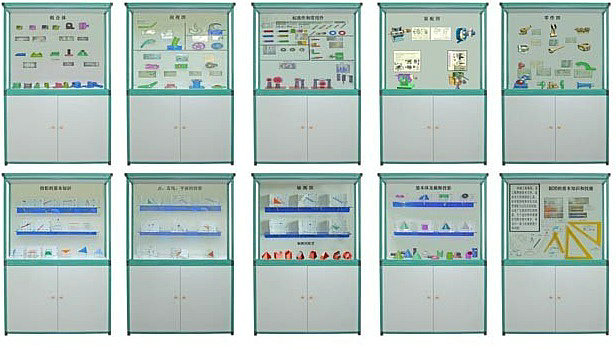 | 第一櫃 製圖基本知識和技能 | 前(qián)言:1、尺寸標注;2、幅(fú)麵;3、圖線;4、字體;5、線段與線框的意義;6、標題欄格式;7、圓錐、小圓錐、圓形量角器、鉛筆、橡皮擦、450三(sān)角板(二種)、600三角板(二種)、曲線板(bǎn)、多孔模板、丁字尺等。(丁字尺的使用;鉛筆的使用;圓錐的使用方法;分錐的使用方法;曲線板的(de)使用方法;丁字尺和和三角板組合使用方法等由多媒體軟件講解演(yǎn)示) | 本套陳列櫃采用121件動畫圖象配合(hé)陳列櫃上的(de)內容在電腦上演示各種模型特點,如製圖工具(jù)的使用、投影(yǐng)產生過程(chéng)、投影作圖步驟、裝配功能等、生動(dòng)形象。 |