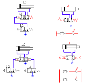1、单作用气缸的换向回路                    2、双作用(yòng)气缸的换向回路