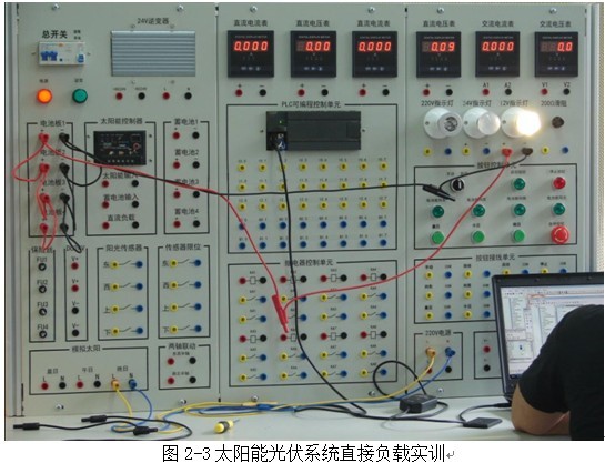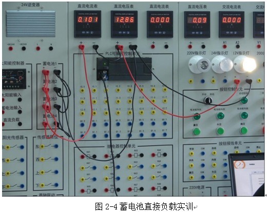 3、太(tài)陽能光伏係統直接負載實訓:將電池板的輸出端串並成24v電壓輸出形式,將線直接接到24v負載兩端,觀察電壓電流的變化情況。在將電池板的輸出端串並成12v電壓(yā)輸出形式,將(jiāng)線直接接到(dào)12v負載兩端(duān),觀察電壓電流的變化情況。如圖2-3所示: