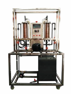采用(yòng)透(tòu)明耐壓(yā)玻(bō)璃作殼體的壓縮機、盤管蒸發器、盤管冷凝器。循環水泵,玻璃轉子流量計,調節(jiē)閥門組、PVC板冷卻水箱(xiāng);測試係統由(yóu)8路萬能信號輸入液晶顯(xiǎn)示巡檢儀、PT100熱電偶組成;有工作台架可隨時移動。