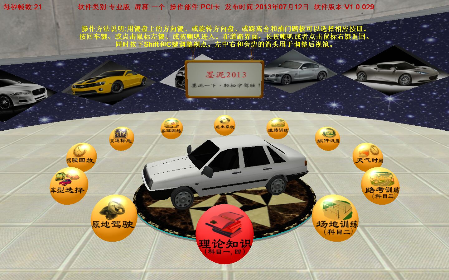 軟件主界麵上共有12個三維按鈕(niǔ),分別為:理論知識(shí)(科(kē)目一,四),場地訓練(科目二),路考訓練(科目三),道路訓練,天氣(qì)時間,軟件設置,退出係統(tǒng),被動駕駛,交(jiāo)通標(biāo)誌,駕駛(shǐ)回放,車型選(xuǎn)擇,原地駕駛(shǐ)。