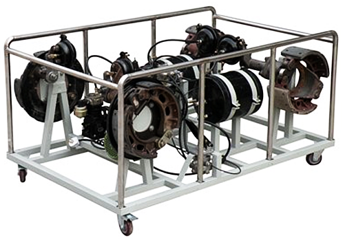 台架結(jié)構:試(shì)驗台由機架、氣壓製動係統總成(chéng)兩部分組成;製動係統零件置於機架之上,結構完整、與實車(chē)相同(tóng)。