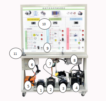 純電動汽車電機性能實驗台部件說明(míng):1-直流永磁電機;2-交流異步(bù)電機;3-開關磁阻電機;4-電池組;5-電池組;6-直流永磁電機控(kòng)製器;7-交流異步電機控製(zhì)器;8-開關磁阻電機控製(zhì)器;9-原理麵板;10-電壓電流表、轉速表、扭矩表、功率表;11-電源總開關;