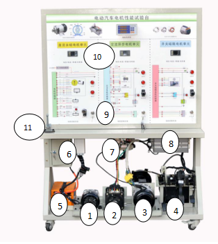 1-直流永磁電機;2-交流異步電機;3-開關磁阻(zǔ)電機;4-電池組;5-電池組(zǔ);6-直(zhí)流永磁(cí)電機控製器;7-交(jiāo)流異(yì)步電(diàn)機控製器;8-開關(guān)磁阻(zǔ)電機控製器;9-原理麵(miàn)板;10-電壓電流表、轉速表、扭矩表(biǎo)、功率表;11-電源總開關;