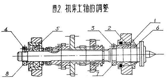 將主軸尾部(bù)鎖緊螺母(mǔ)8上的緊固螺釘4鬆開,沿主軸正(zhèng)轉方向稍微轉動螺母已使軸承5向右移動減少主軸的軸(zhóu)向(xiàng)間隙。調整合適後,把(bǎ)螺母8上的螺釘4因緊即可。