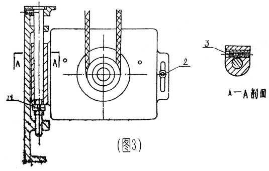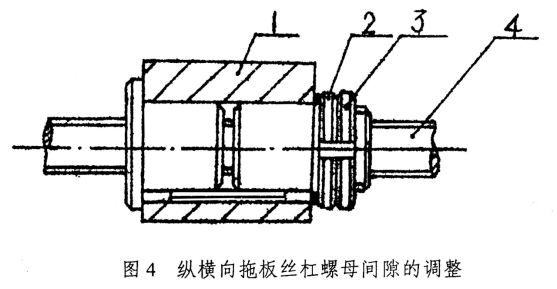 機床使用日久(jiǔ),需要調整縱(橫)向絲杠一螺母間隙時,首先將(jiāng)螺母3鬆開,然後稍微轉動螺母2,使絲(sī)杠右螺母右移即可消除間隙(xì),調(diào)整適當後重新並緊螺母3。(見圖4)