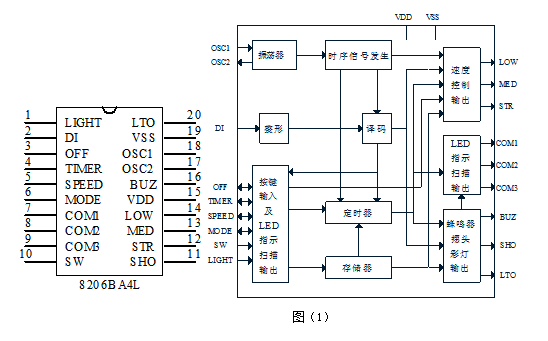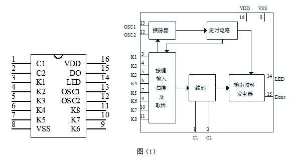 LX5104是一款紅外編碼電路,采用CMOS工藝(yì)製造。該芯片(piàn)共有8個按(àn)鍵,每個按(àn)鍵發一組碼(共(gòng)能發8組碼)。雙(shuāng)鍵或多鍵發的碼視為無效碼。每按(àn)一次鍵,保證至少發兩幀碼。特點為:工作電壓範圍寬(kuān)(Vdd=2.0V~5.0V),按鍵起振功耗低,外圍元器件少,2位可調整用戶碼可以用於不同點(diǎn)機型,38kHz載波紅外(wài)線訊號發(fā)射輸出,LED輸出顯(xiǎn)示發射狀態,發射信號高達8個通道,高噪聲抑製能(néng)力。芯片管(guǎn)腳定義及內部框圖如下圖(1):