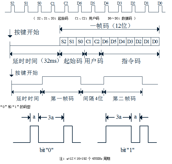 傳送碼的格式是(shì)一個12位的字,由三位起(qǐ)始碼(110),兩位用(yòng)戶(hù)碼(C1、C2),七(qī)位數據(jù)碼組成。