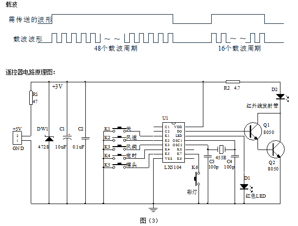 AWJD01掛件上半(bàn)部分(fèn)為遙控器部分,模擬手持遙控器,5V經穩壓成3V供電(diàn),5104芯片編碼,按鍵(jiàn)操作選擇不同編碼組合,按鍵有效指示,編碼信號經放大後由紅外發射管發射。