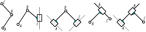 5 = 3,稱為(wéi)Ⅱ級組,由於杆組(zǔ)中轉動副和移動副的配置不同,Ⅱ級杆組共有如下五種形式: