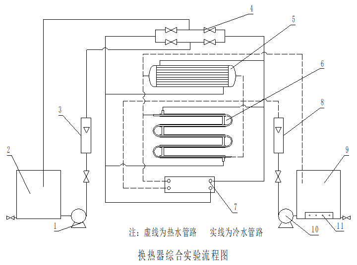 1.冷水泵  2冷水箱(xiāng)  3.冷水流量計  4.冷水順逆流閥門(mén)組 5.列管式換熱器 6.套(tào)管式換熱器  7.板式換熱器  8.熱水(shuǐ)流量計(jì) 9.熱水箱 10. 熱(rè)水泵(bèng) 11 電加熱器  巡檢儀溫度顯示:T1-熱水進口溫度;T2-熱水出口溫度; T3-冷水進口溫度;T4-冷(lěng)水出口溫度
