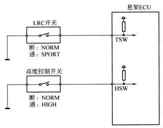 LRC開關和高度控(kòng)製開關(guān)與懸(xuán)架(jià)ECU的聯係如圖所(suǒ)示。當LRC開關和高度控製開關設在(zài)“NORM”位(wèi)置時(shí),12V的電壓分別(bié)加在懸架(jià)ECU的TSW端子和HSW端子;當LRC開關設在“SPORT”位置、高度控製開關設在“HIGH”位置時,懸架(jià)ECU的TSW端(duān)子和HSW端子的電壓變為0V。懸架ECU據此判(pàn)斷設置模式(shì)。當LRC開關設在“SPORT”位置時,組合儀表內的(de)LRC指示燈亮;當高度控製開關設在“HIGH”位置時,組合儀表內的另一高度控製指示燈也亮。
