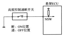 高度控製通(tōng)斷開關(guān)與懸架ECU的聯係如圖(tú)。當開關(guān)撥至OFF位置時,懸架ECU的NSW端子接地,電壓為0V,ECU中止車輛高度控製(zhì)。