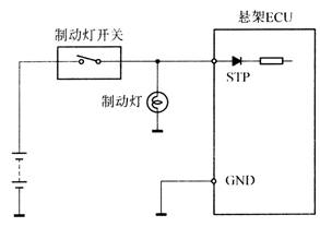 這一開關位於製動踏板支架上(shàng),如圖(tú)所(suǒ)示。當製動踏板踩下時,開(kāi)關接(jiē)通。12V的電壓加在懸(xuán)架ECU的STP端子上,如圖所示。懸架ECU利用這一信號判斷汽車是否在(zài)製(zhì)動(dòng)。