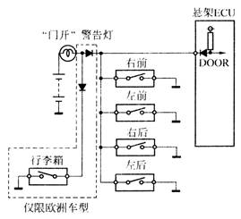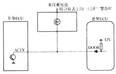 對(duì)於ucF20車型,由於采用了多路傳輸通信係(xì)統,各車(chē)門的門控燈(dēng)開關並非直(zhí)接與懸架ECU相連,而是通過各車門的ECU和車身ECU,最終由車身ECU與懸架ECU發生關係,如圖所示。而結果則與ucF10車型相同,