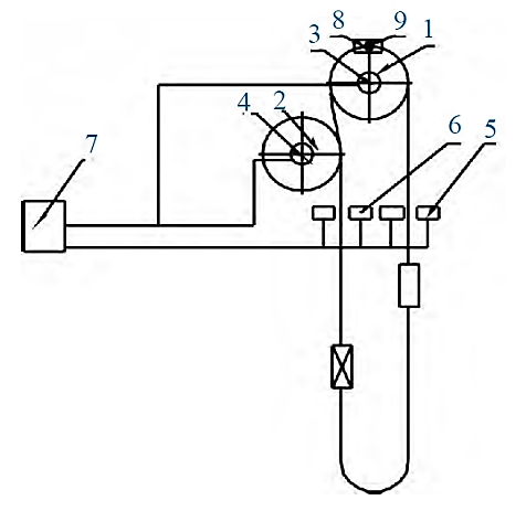 1—摩擦輪(lún);2—導向輪;3、4、9—傳感器;5、6—製動機械手(shǒu);7—PLC 控製係統;8—絞車製動閘