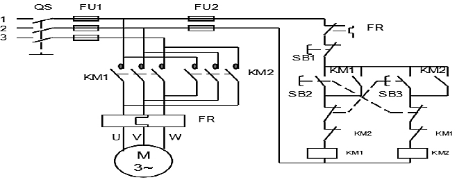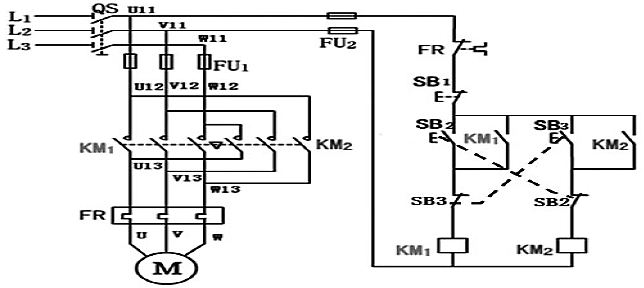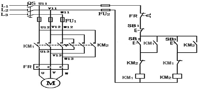三種電路均由電源隔離開關QS;交流接觸(chù)器KM1、KM2;熱繼電器FR;熔斷器FU1、FU2,啟動按鈕SB2、SB3;停止按鈕SB1及電(diàn)動機M組成。電路中各個元件的文字符號、圖形表示、工作原理、實物的觸點等,是學習電路工作原理的基礎。
