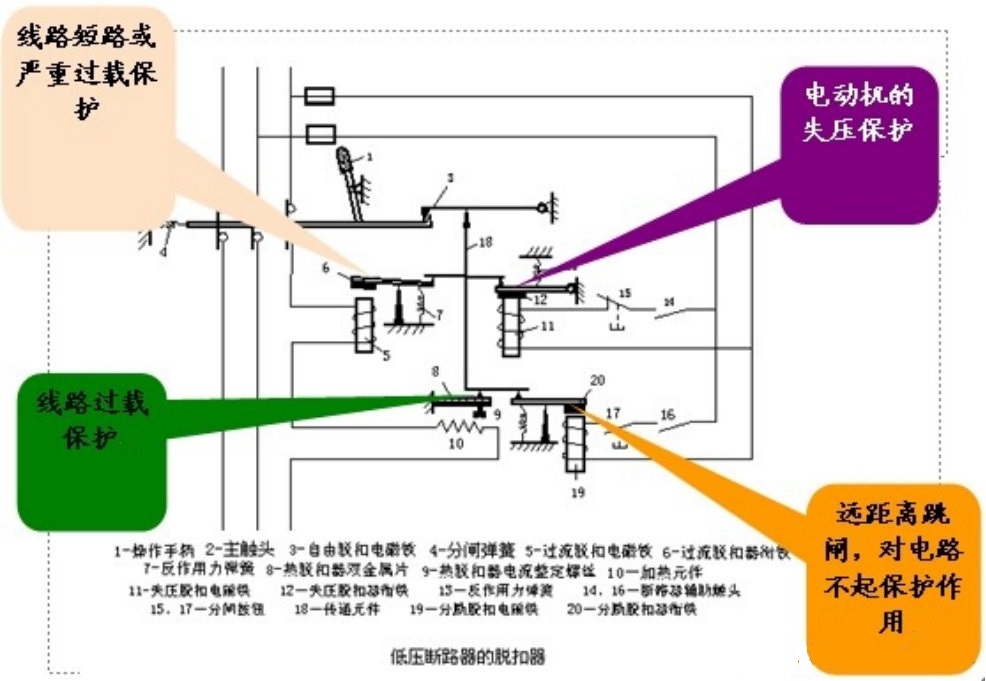 低壓電路器由脫扣器、觸頭係統、滅弧裝置、傳動機構、操作機構、基架和外殼等部分組成。