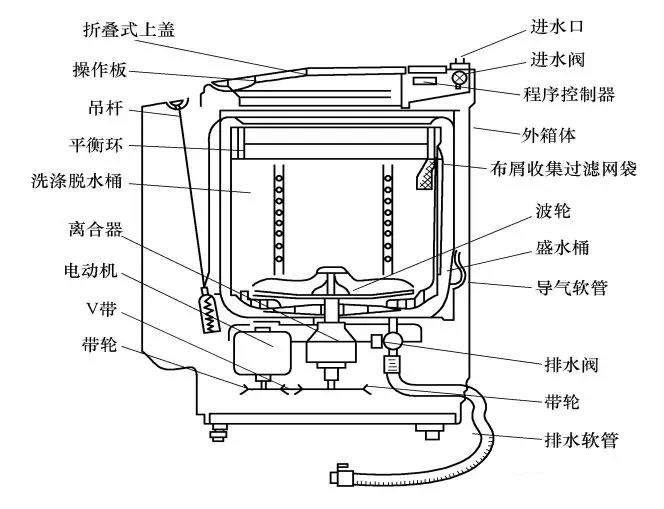 1.典型的波輪全自動洗衣機由盛水筒、洗衣筒(脫水筒)、波(bō)輪(lún)、吊杆、水位開(kāi)關(guān)、注水(進水)電磁閥、排水電磁(cí)閥(排水(shuǐ)泵(bèng))、電動機、減速離合器、箱體、箱蓋及控製(zhì)係統等(děng)組成,如下圖所示。