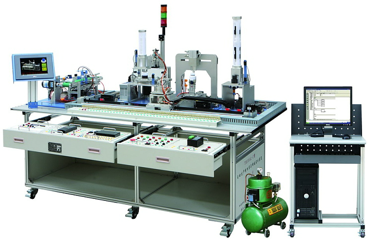 實訓裝置台架為鋁(lǚ)合金(jīn)導軌(guǐ)式,實訓考核(hé)裝置PLC模塊的I/O 端子、變頻器的接線端子、各常用(yòng)模塊與PLC的連接端子,均與安全插座連接,使用帶安(ān)全插頭(tóu)的導線進行電路(lù)連接;各指令開關、光電開關、傳感器和(hé)指示元件的電(diàn)路,則通過(guò)端子排進行(háng)連(lián)接。插拔線連接電路與(yǔ)端子牌連接電路相結合,既保證學生基本技能的訓練、形成(chéng)和(hé)鞏固,又(yòu)保證(zhèng)電路連接的快(kuài)速、安(ān)全和(hé)可靠。