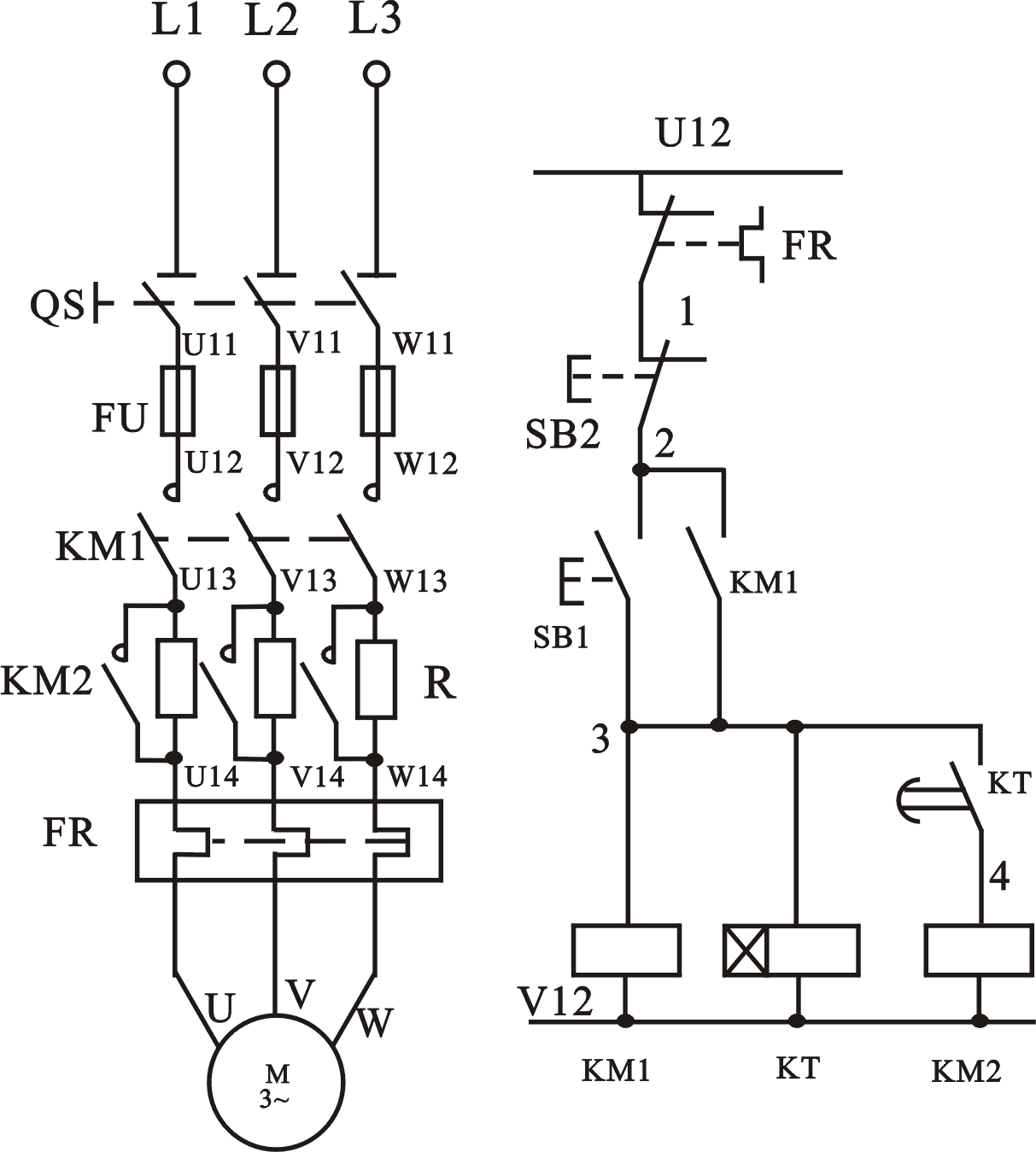 合上電源(yuán)開關QS,按下(xià)起動按鈕(niǔ)SB1,接觸器KM1與(yǔ)時間(jiān)繼電器KT的線圈(quān)同時通電,KM1主觸頭閉合,由於KM2線圈的回路中串有時間繼電器KT延時閉合的動合觸頭而不能吸合,這時電動機(jī)定(dìng)子繞組中串有電阻R,進行降壓起動,電動機(jī)的轉速逐步升高,當(dāng)時間繼電器KT達到預先整定的時間後,其延時閉(bì)合的動合觸頭閉合,KM2吸合,主觸頭閉合(hé),將起(qǐ)動電阻R短(duǎn)接(jiē),電動機便處在額定電壓下全壓運轉,通常KT的延時時間為4~8s。