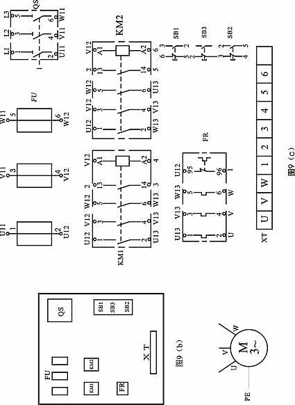 在掛箱上(shàng)選定QS、FU、KM1、KM2、FR、SB1、SB2、SB3及XT等器件。圖1(C)中,各端子的編號法有二種:1)用器件端子的實際編(biān)號,例(lì):KM1的1、3、5、13、A1;FR的95;SB的①②③④等。2)用器件端子的人為編號,例FU的 1、3、5指示燈的1、2等。一(yī)般(bān)器件的端子已有實際編號應優(yōu)先采用,因為編號本身就(jiù)表示了元件的結構(gòu)。例KM1的1與2、3與4代表常開主觸頭;SB的①與②代表動開按鈕,③與(yǔ)④代表動(dòng)合按鈕……。