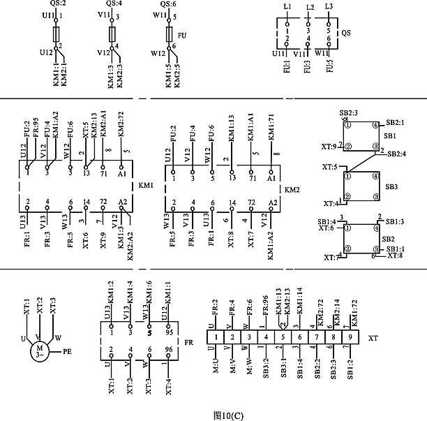 在掛箱上選定QS、FU、KM1、KM2、FR、SB1、SB3、SB2、XT等器件。圖10(c)為用中斷線表示的單(dān)元接線(xiàn)圖,每個器(qì)件端子處接的線號(hào)及端子之間的連線圖上已明確示(shì)出。對接線和查線帶來很大方便。安裝與接線後(hòu),應符合第二章2-1的要求。