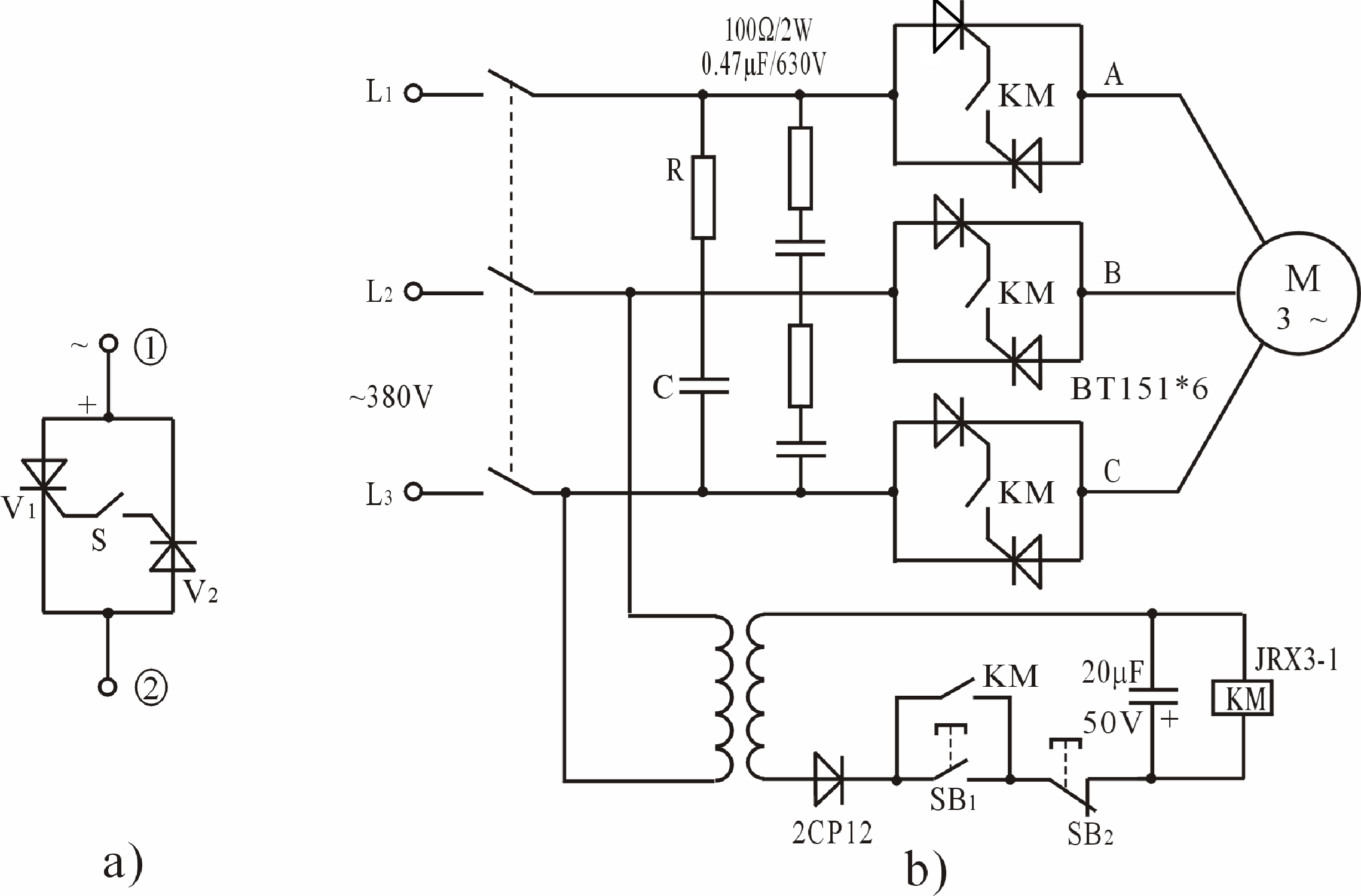 2的關斷,是在(zài)電源(yuán)正弦波電壓過零時自動完成的。如果斷開(kāi)S,原導(dǎo)通的(de)管子在S斷開的半個周波內迅速關斷,電路也就切斷了。這就構成了依靠漏電(diàn)流觸發的簡易交流無觸點(diǎn)開關。這種晶(jīng)閘管(guǎn)開關運行可靠,線路簡單,製造容(róng)易,使用(yòng)中無須調試。管子的(de)選(xuǎn)擇與(yǔ)一(yī)般應用相同(tóng),隻是要(yào)求觸發功率小(xiǎo),特性盡可能一致(可用示波(bō)器觀察正反向波形(xíng)來判斷)。圖b)是實際的車床(chuáng)電源用開關。起動時按下常開按鈕開關SB
