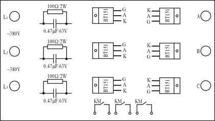 2,KM斷(duàn)電,四個常開觸點(diǎn)同時釋放,晶閘管開關將電機電(diàn)源斷(duàn)開。由(yóu)於KM各觸點起閉電流很小,整(zhěng)個電(diàn)路的可靠性與壽(shòu)命比常用的交流(liú)接觸器電路大為改善。