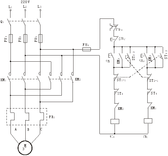 1因線圈斷電而釋放,電機(jī)停轉;同時行程開關ST