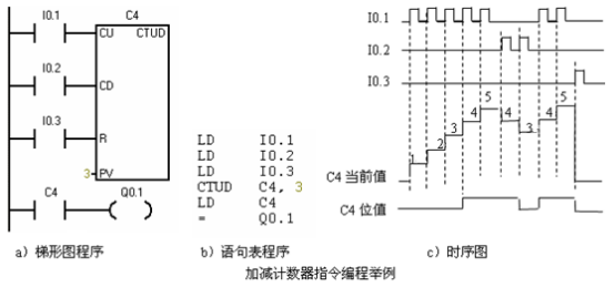 在加計數脈衝輸(shū)入CU的上(shàng)升沿,計數器的當前(qián)值加1,在減計數脈衝輸入CD的上升沿,計數器的當前值減1,當前值大於等於設定值PV時,計數(shù)器位被置位。若複位輸入(rù)R為ON時或對計(jì)數(shù)器執行複位指令R時,計數器被複位 |