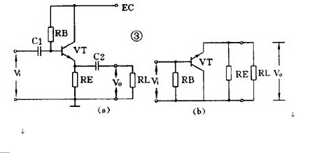 ( 3 )射極輸出(chū)器(qì)圖 3 ( a )是一個射極輸出器。它的輸出電壓(yā)是從射極輸出的。圖 3 ( b )是它的交流通路圖,可以看到它是共集電(diàn)極放大電路。