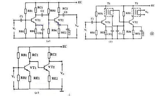 這個(gè)圖中,晶(jīng)體管真正的輸入是 V i 和(hé) V o 的差值,所以這是一個交流負反饋(kuì)很深的電(diàn)路。由於很深的負反饋,這個(gè)電路的特點是:電壓放大倍數小於 1 而接近 1 ,輸出電壓和輸入電壓同相,輸入阻抗高輸出阻抗低,失真小(xiǎo),頻帶寬,工作穩(wěn)定。它經常被(bèi)用作放大器的輸(shū)入級、輸出(chū)級(jí)或作阻抗匹(pǐ)配之用。 ( 4 )低(dī)頻放(fàng)大(dà)器的(de)耦合 一個放大(dà)器通常有好幾(jǐ)級,級與級之間的聯係就稱為耦(ǒu)合。放大器的(de)級間耦合方(fāng)式有三種: ①RC 耦合,見圖 4 ( a )。優點是簡單、成本低(dī)。但性能不是最佳。 ② 變壓(yā)器耦合,見圖(tú) 4 ( b )。優點是阻抗(kàng)匹(pǐ)配好、輸出功率和效率高,但(dàn)變(biàn)壓器製作比較麻煩。 ③ 直接耦合,見圖 4 ( c )。優點是頻帶寬,可(kě)作直流放大器使用,但前後級工作有牽製,穩(wěn)定性差,設計製作較麻煩。 功(gōng)率放大器