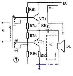 圖 5 是單管功率放大器(qì), C1 是輸入電容, T 是輸出變壓器。它的集電極負載(zǎi)電阻 Ri′ 是將負載電阻 R L 通過變壓器匝數比折(shé)算過來的: RC′= ( N1 N2 ) 2 RL=N 2 RL 負載電阻是低(dī)阻抗的揚聲器,用變壓器可以起阻抗變換作用,使負載得到較大的功率。 這個電路不管有沒有輸入信號,晶體管始終(zhōng)處於導通狀(zhuàng),靜(jìng)態電流比較大,困此集電極損耗(hào)較(jiào)大,效率不高,大約隻有(yǒu) 35 %。這種工作(zuò)狀態被稱為甲類工作狀態。這種電路一般(bān)用在功率不太大的場(chǎng)合,它(tā)的輸入方式可(kě)以是變壓器耦合也可(kě)以是 RC 耦合。 ( 2 )乙類推挽功(gōng)率放大器 圖 6 是常用的乙類推挽功率放大電路。它由兩個(gè)特性相(xiàng)同的(de)晶體管組成對稱電路,在沒有(yǒu)輸(shū)入信號時,每個管子都處於截止狀態,靜態電流幾乎是零,隻有(yǒu)在有信號輸入時管子才(cái)導通(tōng),這種狀態稱為乙類工作狀(zhuàng)態(tài)。當(dāng)輸入信號是正弦波時,正半周時(shí) VT1 導通 VT2 截止,負半周(zhōu)時 VT2 導(dǎo)通 VT1 截(jié)止。兩個管子交替出現的電流在輸出變壓器中合成,使負載上(shàng)得到純正(zhèng)的正弦波。這種兩管交(jiāo)替工作的形式叫做推挽電路。