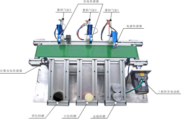 物料檢測: 物料檢測為光電漫對射型傳感器,主要(yào)為PLC提(tí)供一個輸入信號,如果料(liào)筒中有物料,就會驅動推出氣缸推出物料;如果運行中,光電傳感器沒有檢測到物料並保持2秒鍾(zhōng),則讓係統停機然後報警。