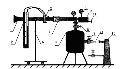 1-入口段 2-U型管压(yā)差计(jì) 3-孔板流量计 4-喷管试验段 5-真空表(biǎo)6-支撑(chēng)架 7-稳压罐 8、9-调节阀 10-真空泵  11-探(tàn)针自动移动机构  12-探针手(shǒu)动移动机构(手枪) 13-橡胶接管
