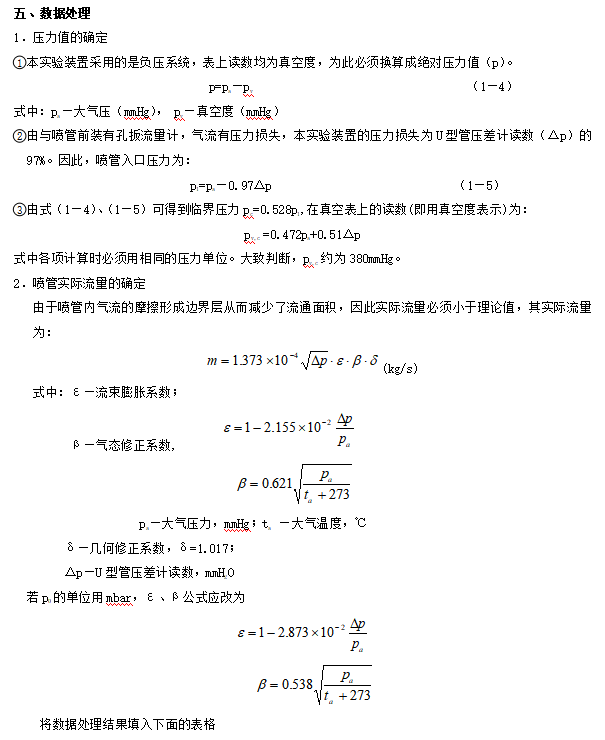 喷管(guǎn)的背压(yā)由固定在排气管(guǎn)段上(shàng)的真空表(biǎo)测定,通(tōng)过喷管的空(kōng)气流量则由孔扳流量(liàng)计及U型管压差计(jì)测(cè)定。