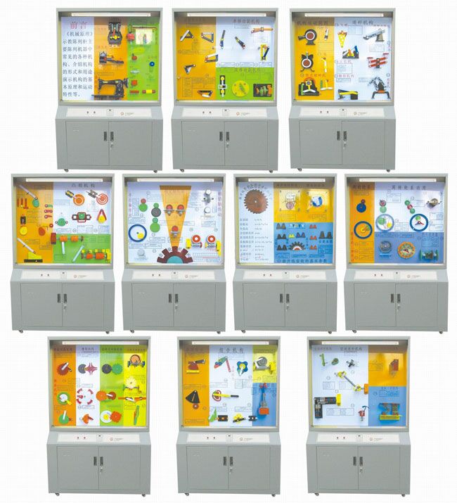 | 第九柜 组合机(jī)构 | 65、行程扩(kuò)大机构 66、换向机构 67、齿轮连杆机构 68、实现给(gěi)定轨迹的机构 69、实验变速运动的机构 70、同轴槽轮机构 71、误差较正机构 72、电动马游戏装置 |