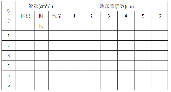 4.改變流量(liàng)調節閥12開度4~5次,分別測記測壓管讀數及流量。