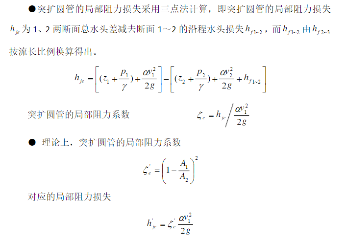 突擴和突縮圓管的局部(bù)阻力損失由前後兩斷麵的能量方程,根據推(tuī)導條件,扣除沿程水頭損失求得。