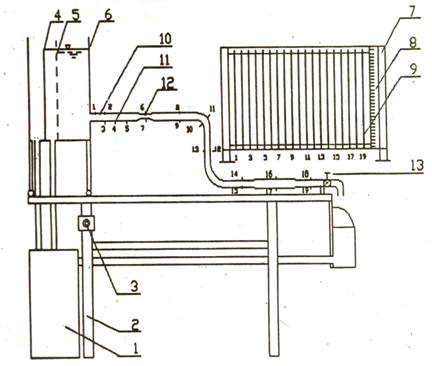 1.自循環供水器 2.實驗台 3.可控矽(guī)無級調速器 4.溢流板 5.穩水孔板 6.恒壓水箱 7.測壓計 8.滑(huá)動測量尺 9.測壓管 10.實(shí)驗管道 11.測壓點 12.畢托管 13.實驗流量調節閥
