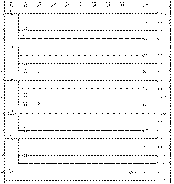0 LD X002 1 ANI Y000 2 ANI Y001 3 ANI Y002 4 ANI Y003 5 ANI Y004 6 ANI Y005 7 ANI Y006 8 ANI Y007 9 SET S1 11 STL S1 12 OUT Y003 13 OUT T0 K10 16 LD T0 17 OUT Y000 18 LD X000 19 SET S2 |