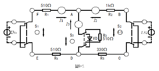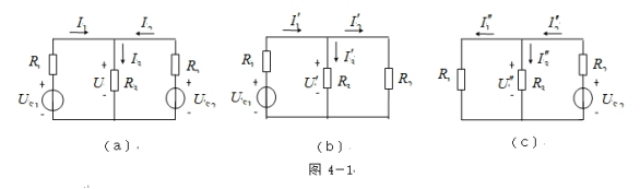 3.US1和US2共同作用時(開關S1和(hé)S2分別投向US1和US2側),各電流、電壓的(de)參(cān)考方(fāng)向見圖4-2。