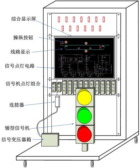 城軌正線信號機設備(bèi)實(shí)訓演練平台由信號組合櫃、信號繼電器、三顯示矮型信號機、信(xìn)號(hào)變壓器、燈絲繼電器、XB箱、信號機及(jí)控製電路狀態顯示計算機、顯示屏、電源模塊、數字量驅動采集模塊、斷路器、練(liàn)功平台車(chē)等設備組成(chéng),設備外觀(guān)結構如下圖所示(shì)。