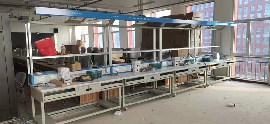 1、實訓台:采用工業鋁合金(jīn)型材框架,共兩層,其中第一層可放置(zhì)維修工具、套件、儀器儀表;第二層可放顯示器,頂部設有30W日光燈一(yī)盞和風扇一台。實訓台設有一個抽屜、兩個鍵盤(pán)托架(jià)、兩個主機櫃,下方有四個刹車的萬向輪。