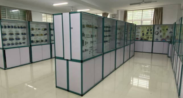 二、機械零件示教陳列櫃:機械零件在課程體係中的地位是一門論述機械零件設計理論、研究機械(xiè)零件設計方法的設計性技術(shù)基(jī)礎課。是多學科知識的綜合運用(yòng)。機械零件陳列櫃共(gòng)分二十個櫃,400餘種物零件模型。外型用高級鋁合(hé)金櫃架(jià),板麵(miàn)用紫紅(hóng)色金絲絨做底,模型材料(liào)用各色有(yǒu)機玻璃和硬聚氯(lǜ),並附有銀(yín)滌淪不幹(gàn)膠作必(bì)要圖(tú)表和文件字說明,形象逼真,製作工藝美觀。使用機械零件陳列櫃能(néng)提高教學效果,節約學時,是一套理想機(jī)械課程(chéng)的示教陳列室設備。