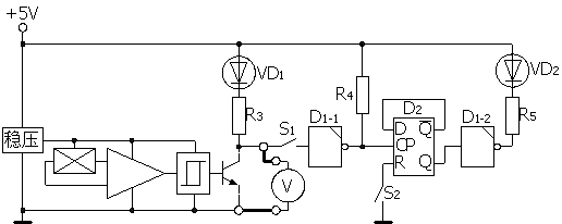 將(jiāng)S1接通,S2斷開(S2用於提供複位信號),整個係統即構成鎖存開關。先將S2接(jiē)通,再(zài)斷開,使觸發器複位,用磁鋼接(jiē)近霍爾電路,觀察(chá)VD1和VD2的亮(liàng)滅情(qíng)況,再使磁鋼離(lí)開霍爾電路,觀察VD1和VD2的亮滅情況,了解(jiě)鎖存開關是(shì)怎樣鎖(suǒ)住狀態的。
