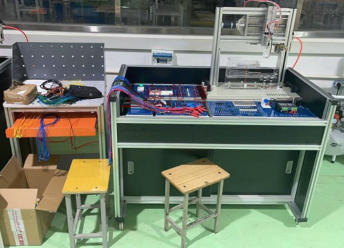 13、智能物料搬運(yùn)裝置: 配置雙軸機器人作(zuò)為裝配的執行機(jī)構,具有X軸、Y軸兩個方向的執行能力,可完成智能抓取(qǔ)物料放料等功能;配(pèi)置有行程開關,光電傳感器,光纖(xiān)傳感(gǎn)器等,可確保各執行器的準確定位(wèi);超出最大行程時,具有硬(yìng)件自動保護功能,確保係統安全及人身安全;本(běn)裝置為通用的模塊化的多功能裝置,各功能端(duān)口完全開放,可以能過不(bú)同的(de)接線(xiàn)來完成各種不同的功能,為學生的創新設計提供了廣闊的發揮空間。