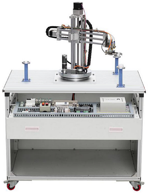 機械手實訓裝置由實訓桌(型材結構)、旋轉底座、三維(X、Y、Z)運動機械及電(diàn)手控製等六部分組成(chéng)。三維運動機械部分采用滾珠絲杠傳動和齒輪(lún)傳動(dòng)相結合的模塊化結構。具備底盤旋轉、手(shǒu)臂升(shēng)降、手臂伸縮、吸盤旋轉四個自由度控製的功能,可實現在一定範圍內物(wù)體的抓取控製,用於實現定位功能。
